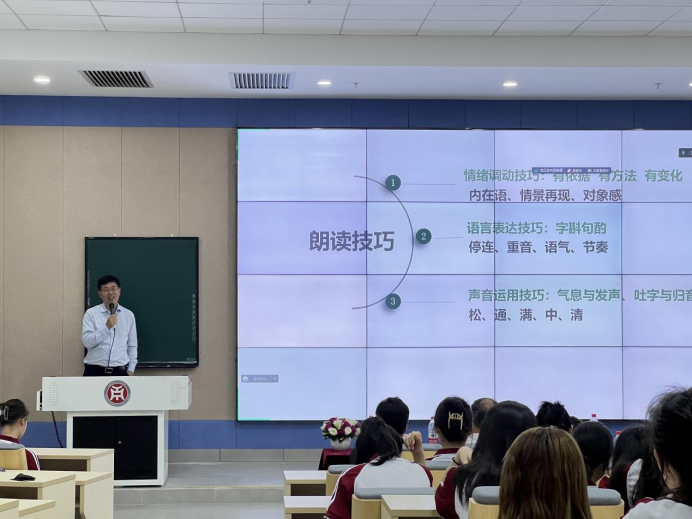 接着,何山老师为同学们介绍朗读的技巧,在朗读或者表演的时候,需要在心里有内在语,还要在脑子里情景再现,并且要有对象感。在语言表达技巧方面,字斟句酌,懂得停读技巧,重音技巧,在说话语气方面,要有上扬下抑,平直曲折。节奏也很重要,能够给人带来不一样的感受。在声音运用技巧方面,气息与发声讲究松、通、满,在吐字与归音方面讲究中、清。