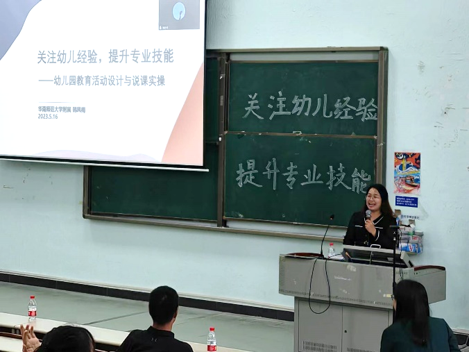 为提升教师教育学院学前教育专业学生师范生技能水平,2023年5月16日下午,华南师范大学附属幼儿园副院长韩凤梅应邀在我校励志楼B407开展以“关注幼儿经验,提升专业技能”为主题的幼儿园教育活动设计与说课实操讲座。增城校区20级全体学前教育同学线下参会,21级和四会校区22级学前教育同学通过腾讯会议同步与会。